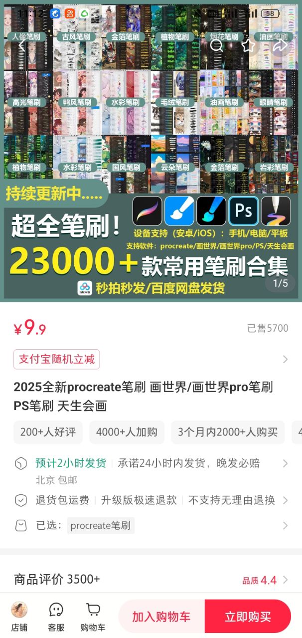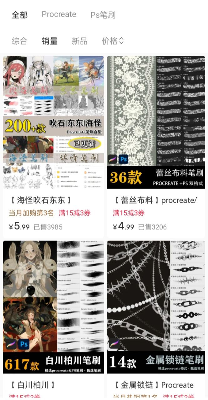 而且他们都懂以量取胜的道理,比如,卖笔刷不说几十款,非得说,2300+常用笔刷合集,用户一看数字这么大,就觉得花几块钱买这么多,太值了,哪怕里面有一半用不上,也觉得不亏。